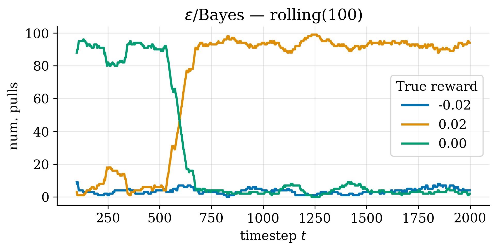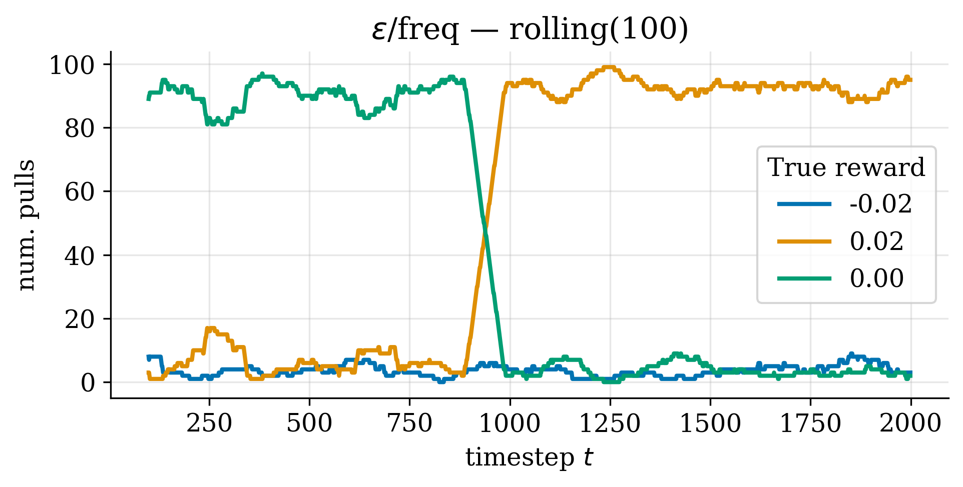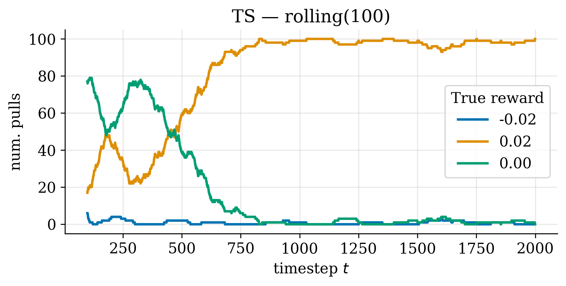 Next, we show the rolling sum of the number of times each action was pulled.