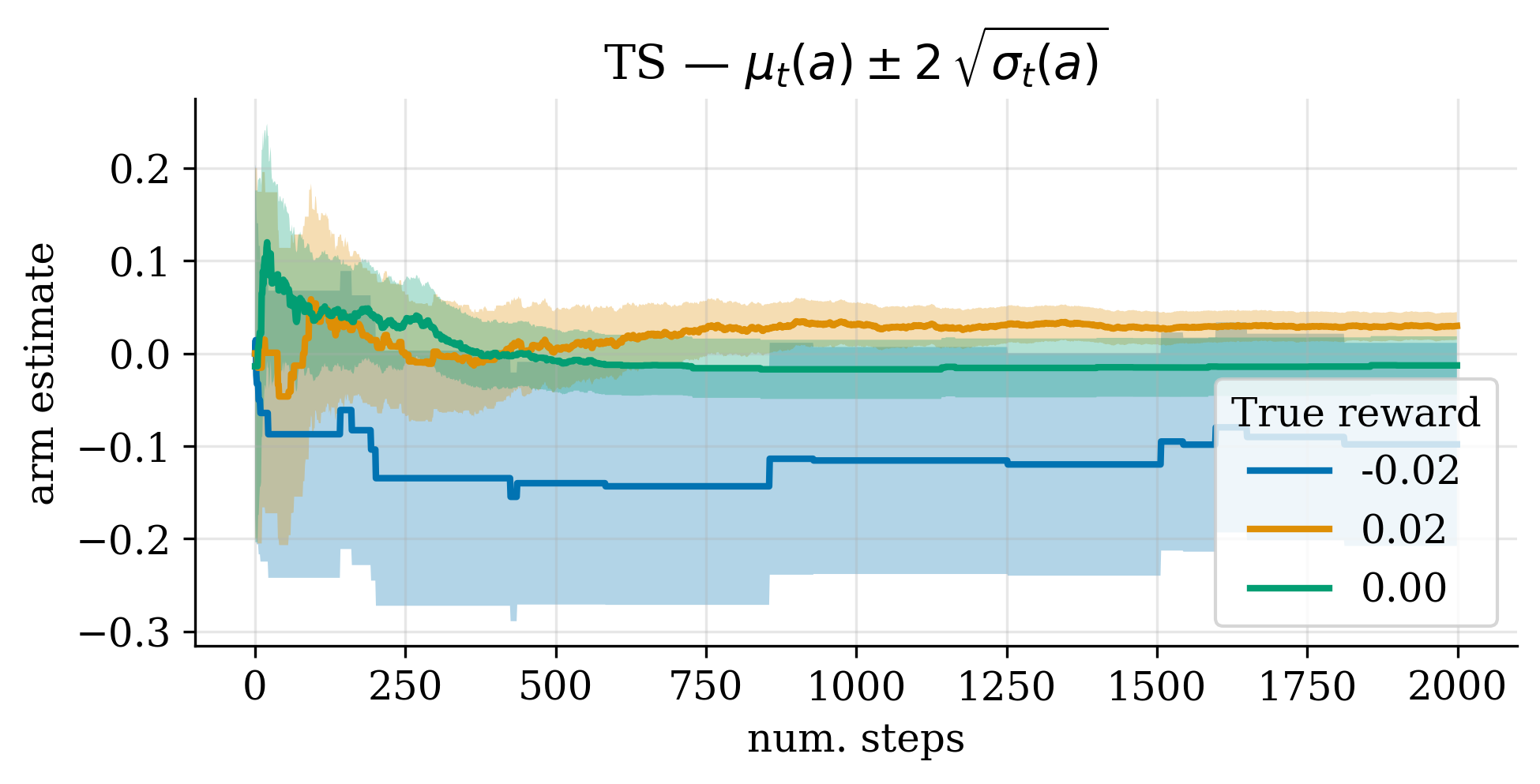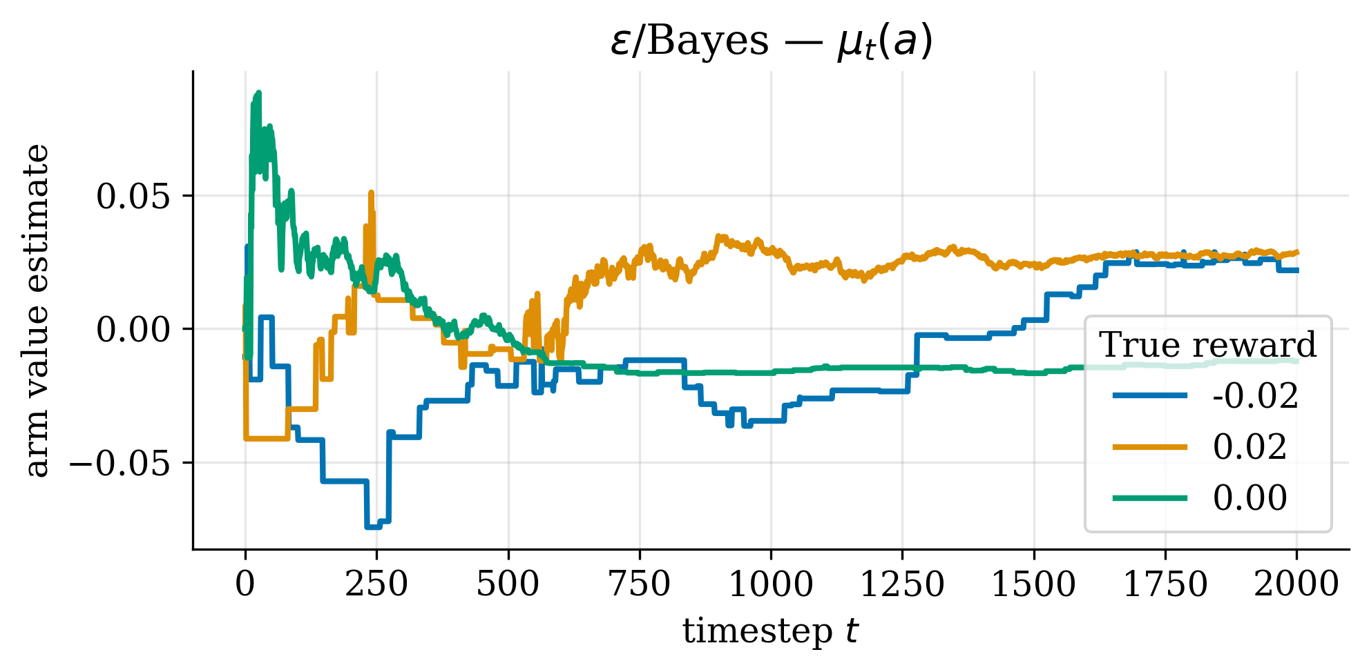 The Figures below show the result of running the Bayesian TS bandit. First, we show the estimated value of actions as a function of the timestep.