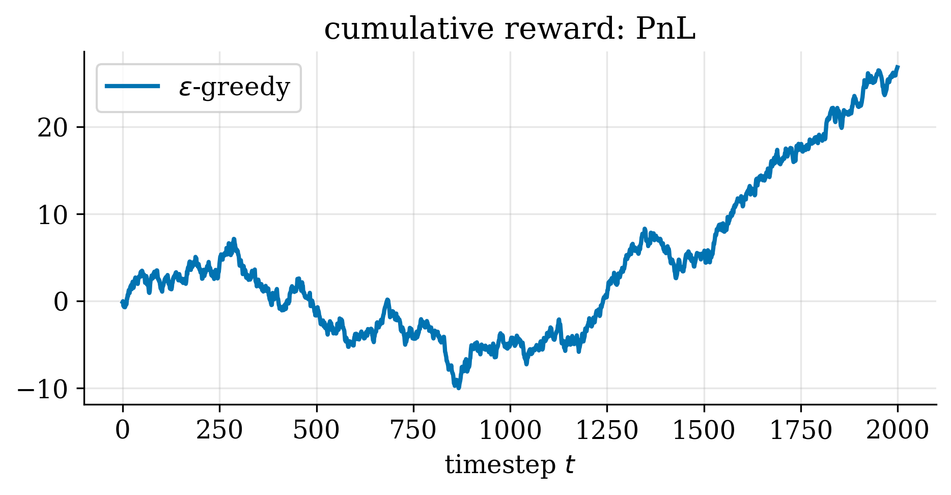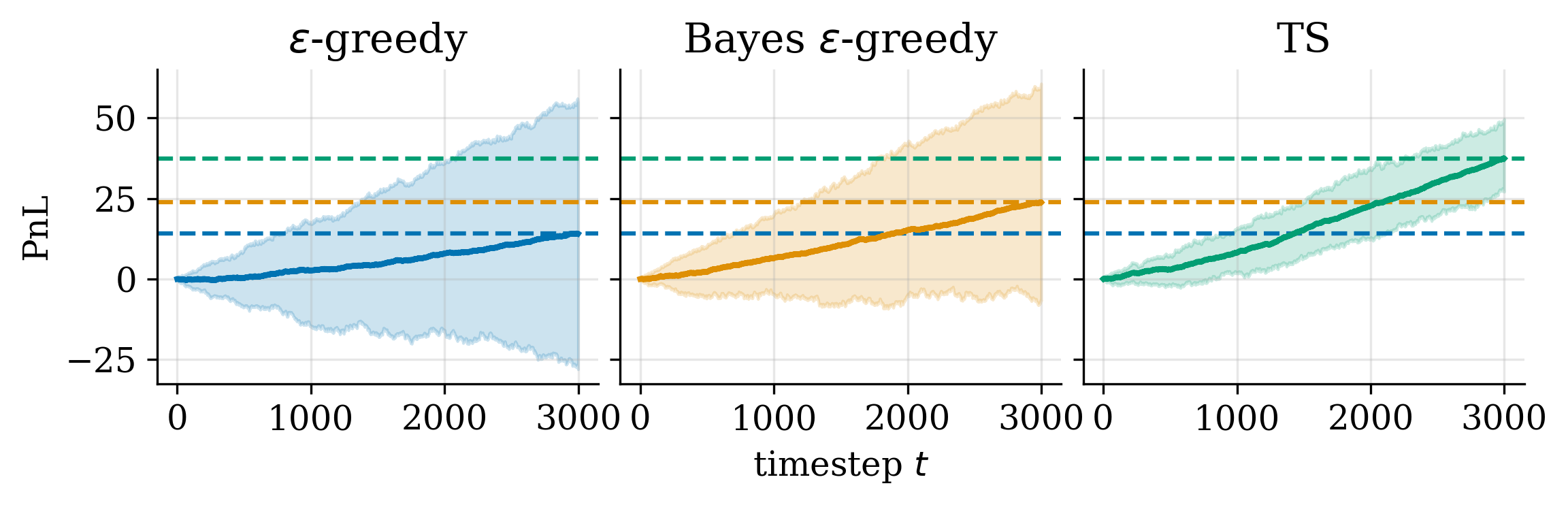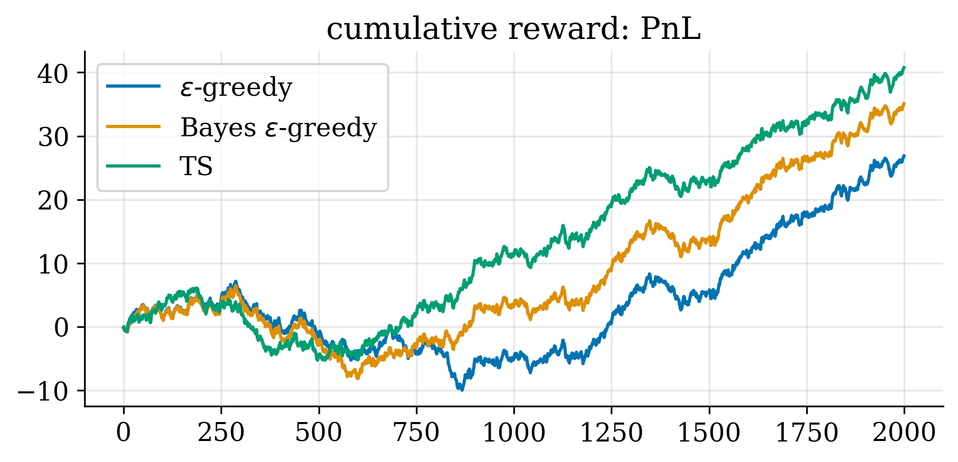 Finally, we show the profit and loss (PnL) as a function of time for both the classical $\epsilon$-greedy and the Bayesian $\epsilon$-greedy agents.