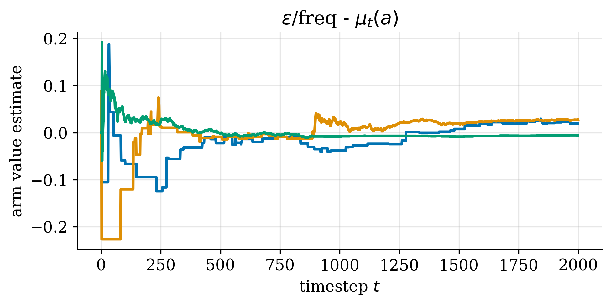 The first kind of algorithm we’ll study is $\epsilon$-greedy. Simply put, this algorithm defines a policy that, with probability $1 - \epsilon$, chooses the action that it believes pays the most, and, with probability $\epsilon$, chooses a random action. The beliefs $\vb_t$ are defined as the (frequentist) estimate of the expected value for each action.